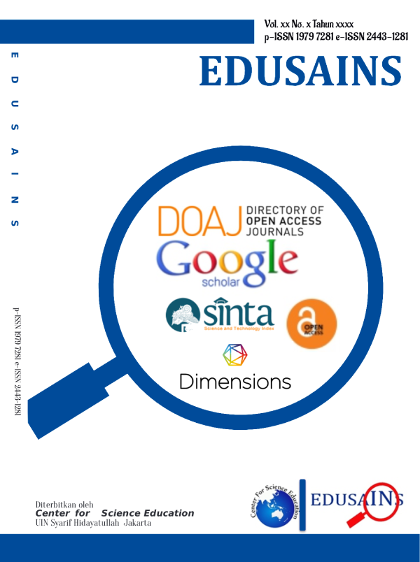 EDUSAINS is a journal publishing the Natural Science Education, Biology Education, Physics Education, and Chemistry Education Journal. Edusains is published by Center for Science Education (CSE) which is located in Departement of Natural Science Education,Faculty of Educational Sciences, UIN (State Islamic University) Syarif Hidayatullah Jakarta. Editors welcome scholars, researchers and practitioners of education around the world to submit scholarly articles to be published through this journal. All articles will be reviewed by experts before accepted for publication. Each author is solely responsible for the content of published articles.