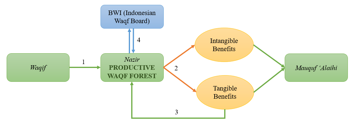 Previous studies about waqf for forest conservation mostly concentrated on its potential or its prospect for forest preservation or environmental protection. In contrast, a detailed discussion about how to establish a waqf forest to support the SDGs is still noticeably absent. This paper aims to formulate a scheme of productive waqf forests that can help the achievement of Sustainable Development Goals (SDGs). To our knowledge, this is the first paper that provides a scheme of productive waqf-based forest. The present study was conducted using a literature study method and interpretative analysis. The result shows that a productive waqf forest should supply not only intangible benefits but also generate tangible benefits that can be used for the waqf forest development. Both benefits which support some main points of SDGs, such as in reducing poverty and hunger, maintaining climate, health, biodiversity, and water supply, are mainly delivered to the mauquf’alaihi.JEL Classification: D64, G23, Q01, Q23, Z12.