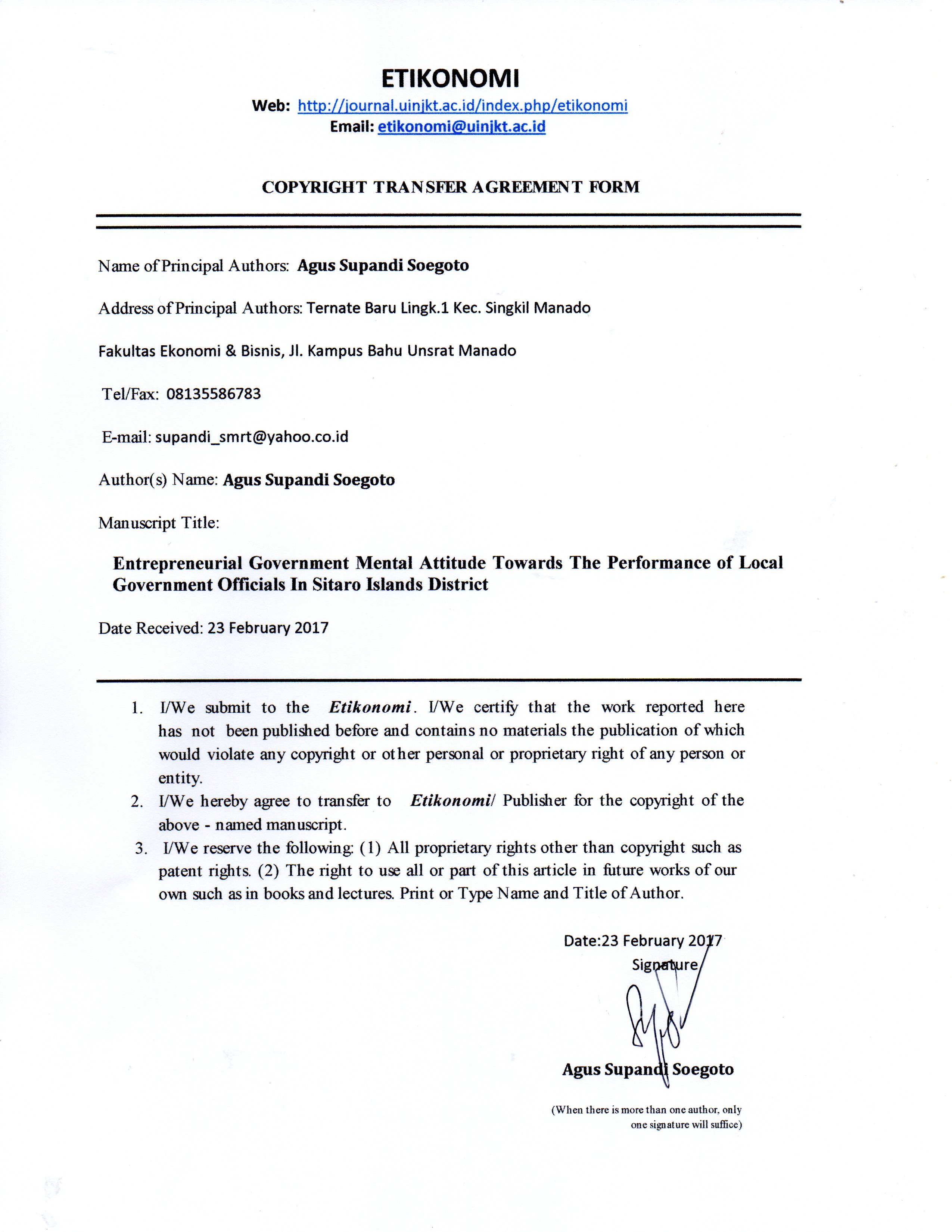 Public demand for the implementation of good governance in the public sector for several years has been increasing because the performance of public services does not seem to meet public expectations. The purpose of this study is to determine the influence of entrepreneurial mental attitude on the performance of the government apparatus in the district of Sitaro Islands. The analytical method used is associative and relies on multiple linear regression. The results show that both simultaneously and partially, entrepreneurial government mental attitudes including innovator, brave and creative attitudes, creating value and recognizing opportunities, communication skills, human mobility, and resource have a positive and significant impact on the performance of government officials. The results also show the attitude of innovators has the lowest variable value which means that the leaders should enhance the attitude of Mental Entrepreneurial by improving the employees’ attitude of innovators, either through leadership training, entrepreneurship, or education quality improvement, therefore the performance of the officials may be enhanced.