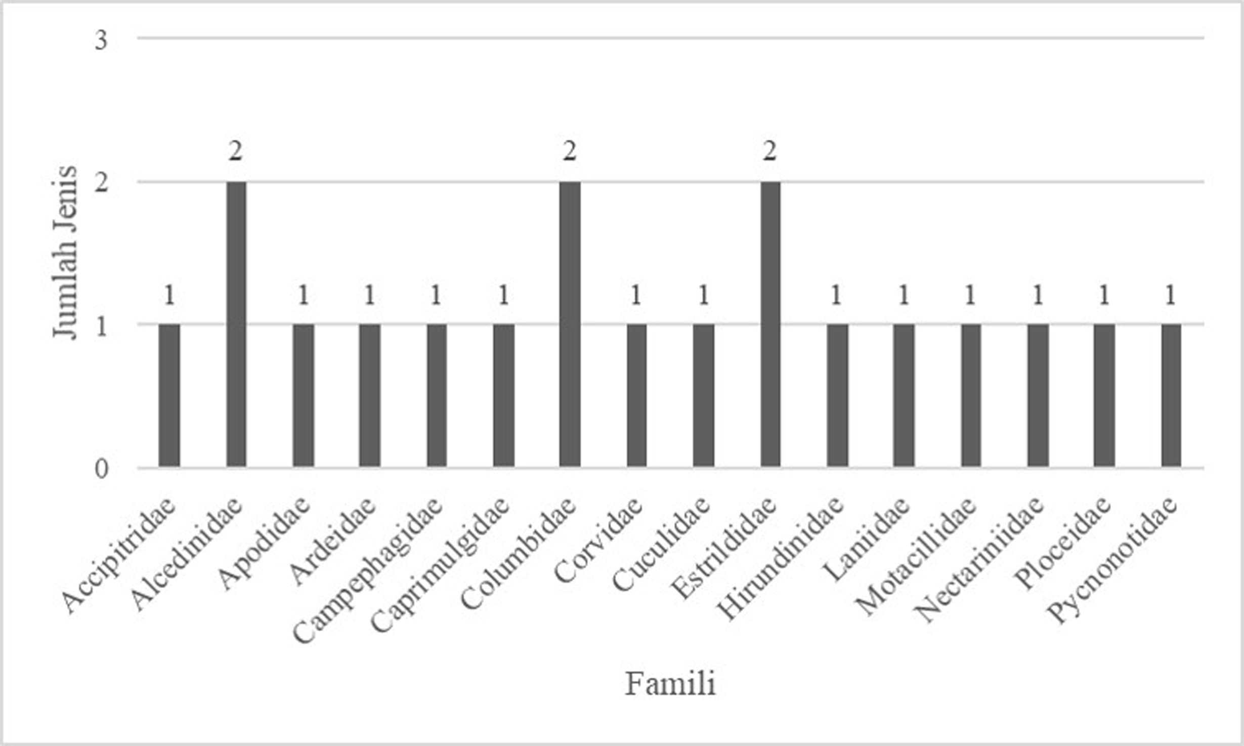 Institut Teknologi Sumatera (ITERA) campus area is undergoing rapid physical development, such as the construction of lecture buildings, laboratories, dormitories, as well as reservoirs for water sources. Information on biodiversity in ITERA has not much studied, one of which is bird diversity. Birds are large animals that are quite sensitive to environmental changes. This study aims to obtain data on bird diversity at ITERA to provide the baseline information. The method used is a point count technique, applied to five main stations selected based on the center of development activities. The analysis used is an index of diversity, evenness, and abundance. Besides, the conservation status and feed type of bird species were analyzed using secondary data. The results showed that there were 19 species of birds from 16 families. The Shannon-Wiener diversity index classified the bird community as a moderate, and the community evenness index was stable. From the abundance category, two types of birds commonly found. Based on PP No. 7 of 1999, there are four species of birds in ITERA, which included in the protected category and one species, including the Appendix II category in CITES. Omnivorous and insectivorous types dominate bird guild feeding in ITERA.